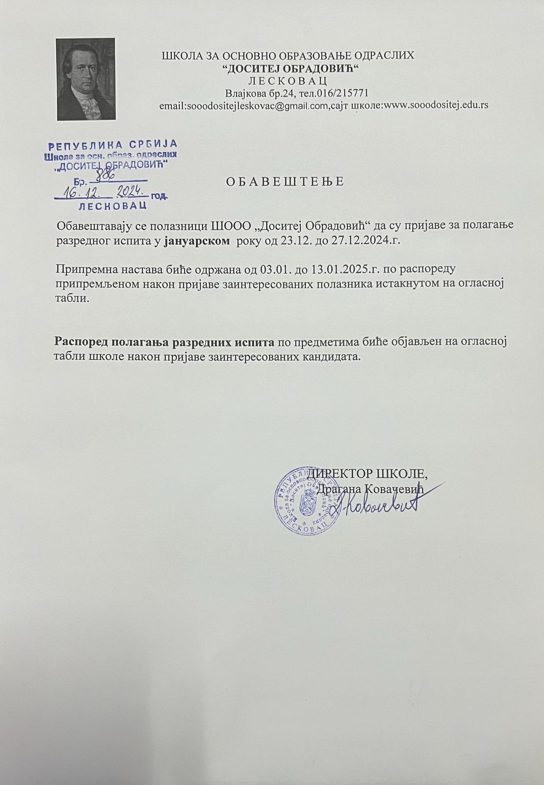 Обавештавају се полазници ШООО „Доситеј Обрадовић“ Лесковац да су пријаве за полагање разредног испита у јануарском року од 23.12.2024.год. до 27.12.2024.год.